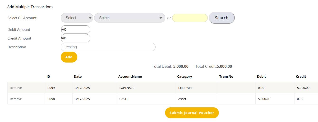 - You can then click on ‘Submit Journal Voucher’ button to commit the transaction for approval