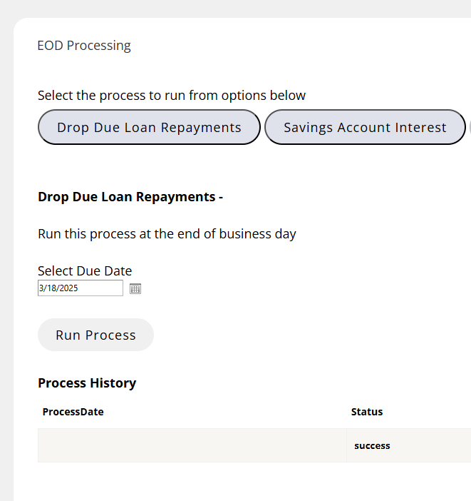 - On the EOD processing sub menu click on ‘Drop Due Loans’